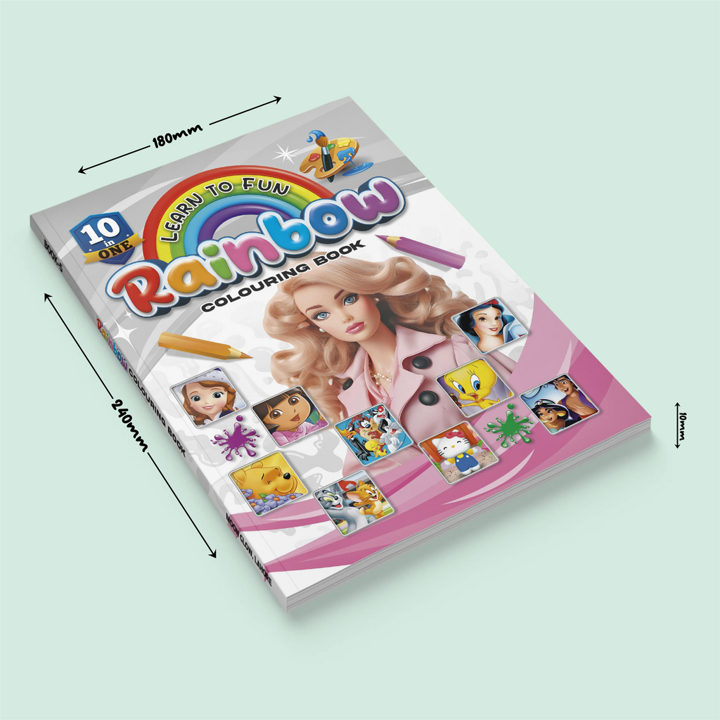 Rainbow Coloring Book 10 in 1 is a vibrant collection featuring ten favorite characters, including "Barbie, Sofia, Dora, Snow White, Pooh, Baby Looney Tunes, Tweety, Tom and Jerry, Hello Kitty and Aladdin". With 160 pages of detailed illustrations, each page has one picture for coloring on both sides. Made with high-quality offset paper and durable card binding, this book provides endless creativity and fun.